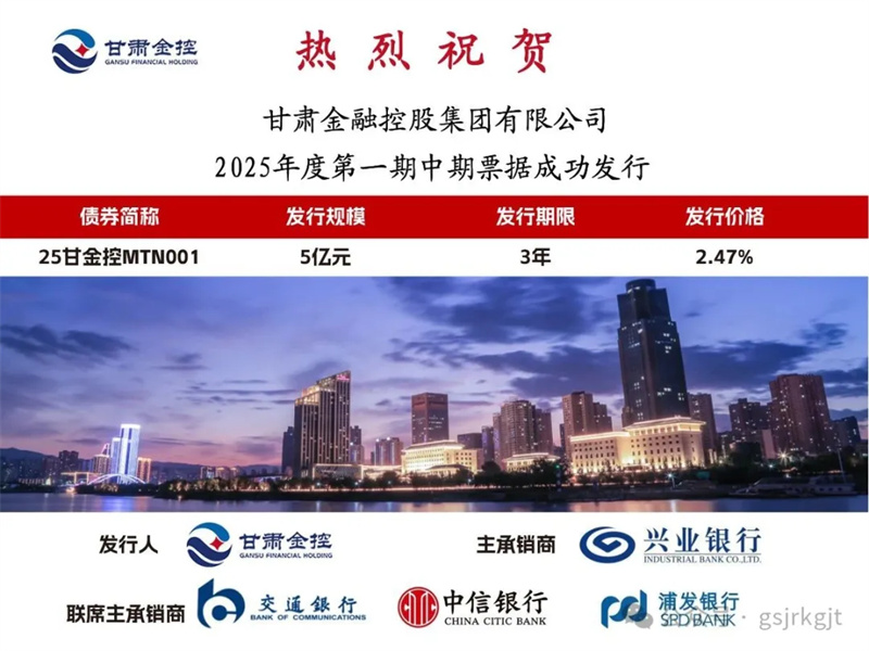 2025年6月10日,甘肅金控集團成功發(fā)行2025年度第一期中期票據(jù)“25甘金控MTN001”,規(guī)模5億元,期限3年,票面利率2.47%,全場倍數(shù)2.72倍,體現(xiàn)出市場對集團穩(wěn)健經(jīng)營和良好償債能力的信心。