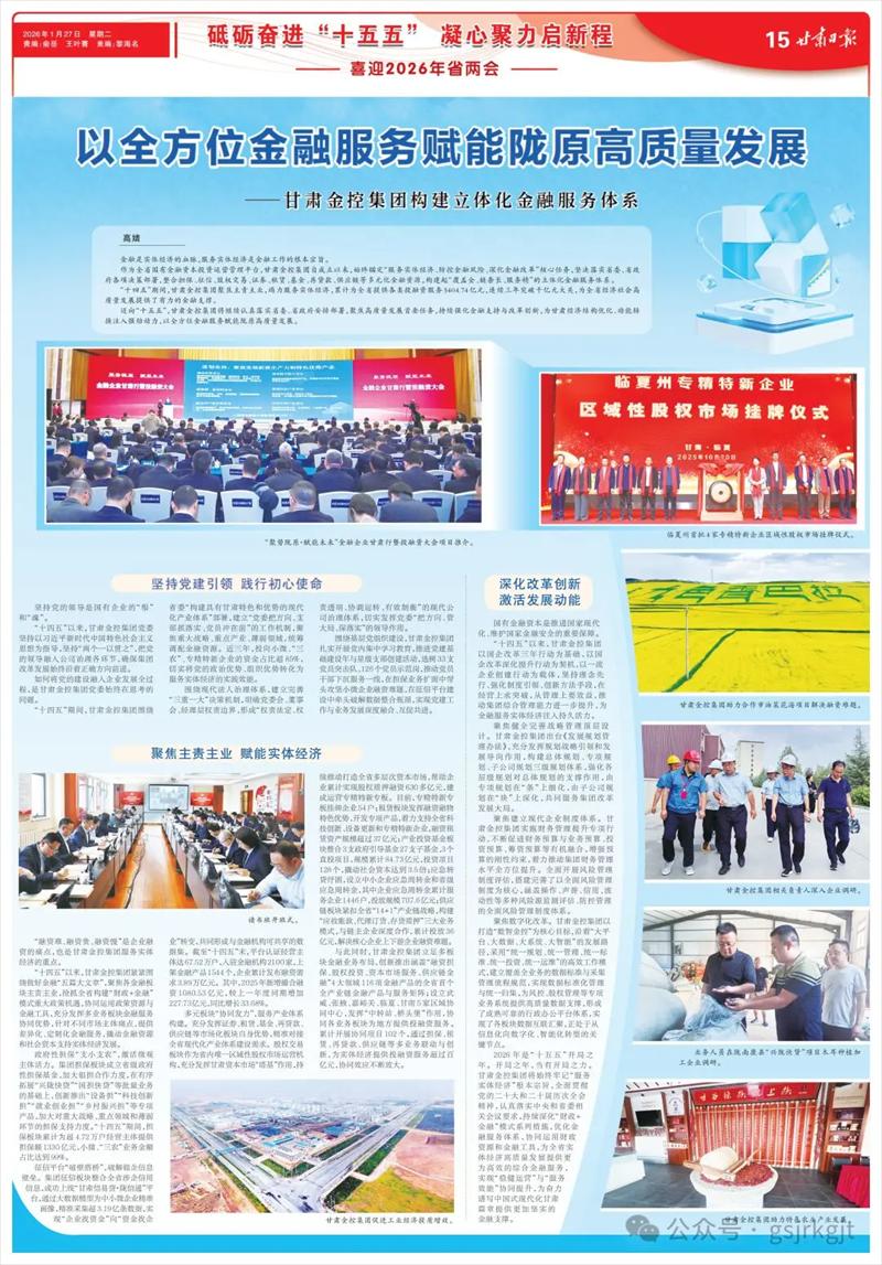 2026年是“十五五”開局之年。開局之年,當有開局之力。甘肅金控集團將始終牢記“服務實體經濟”根本宗旨,全面貫徹黨的二十大和二十屆歷次全會精神,認真落實中央和省委相關會議要求,持續深化“財政+金融”模式系列措施,優化金融服務體系,協同運用財政資源和金融工具,為全省實體經濟高質量發展提供更為高效的綜合金融服務,實現“穩健運營”與“服務效能”協同提升,為奮力譜寫中國式現代化甘肅篇章提供更加堅實的金融支撐。(高婧)