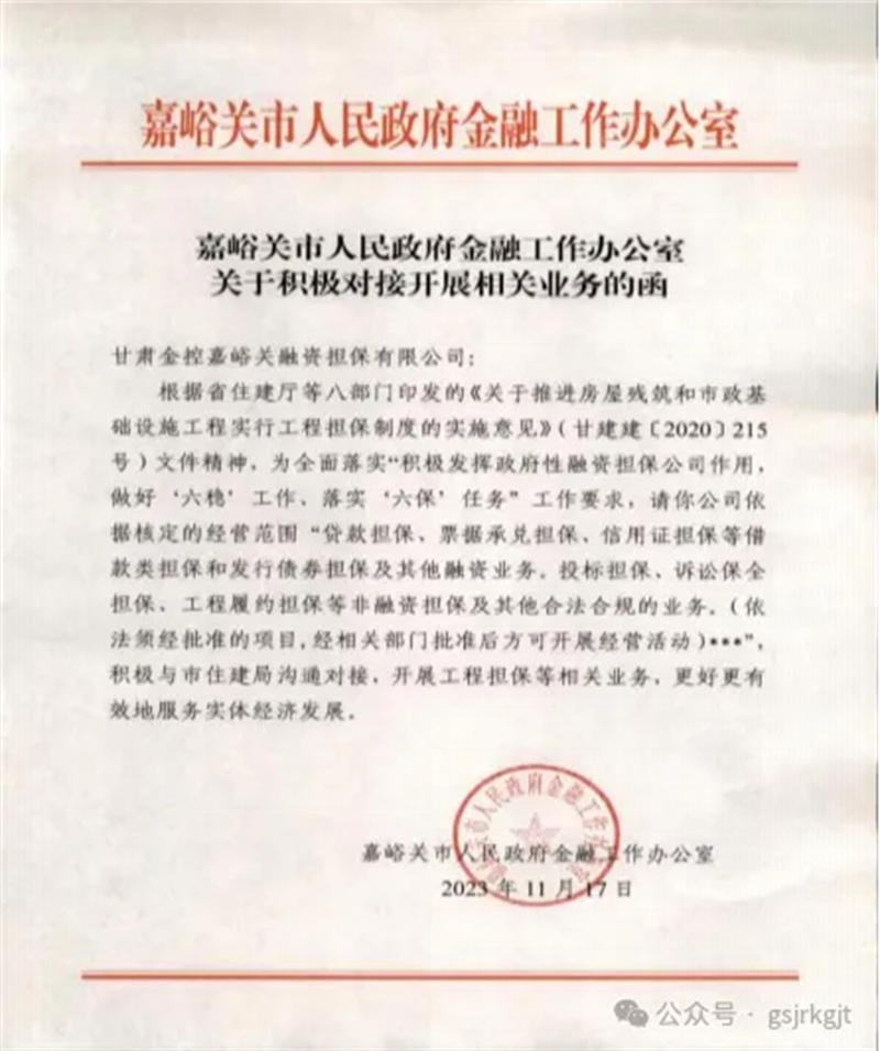 金控嘉峪關擔保公司通過開展履約保函等工程擔保業務,在助力強化建筑領域風險管理和建立健全建筑市場誠信機制中充分發揮政府性融資擔保機構職能,為更好服務地方實體經濟發展努力貢獻自身力量。