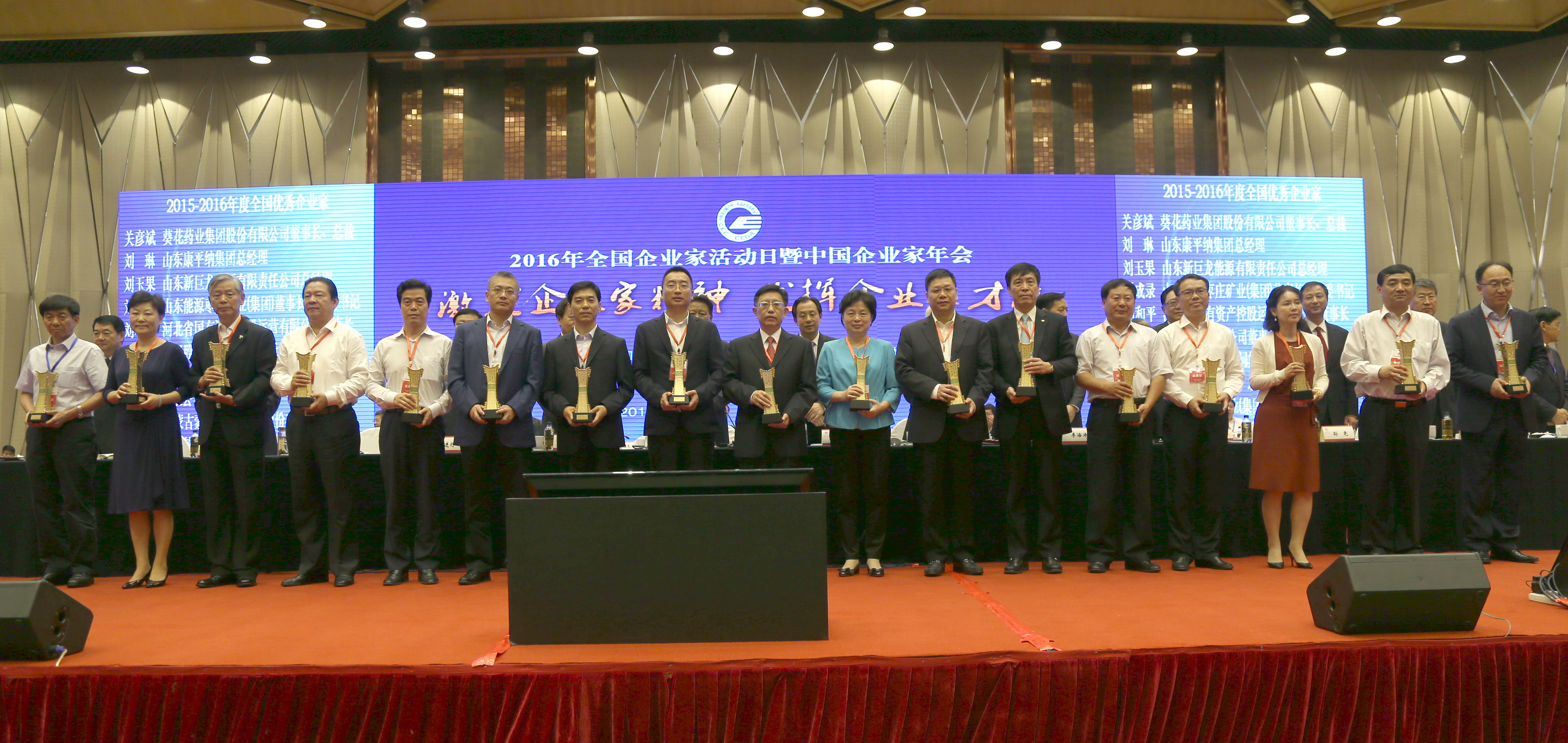 2016年全國企業家活動日暨中國企業家年會由中國企業聯合會、中國企業家協會和黑龍江省人民政府共同主辦。來自中國企業聯合會、中國企業家協會,黑龍江省,國務院國資委的領導,以及全國各地的企業家、專家學者,中企聯和各省(區、市)企聯、企業家協會負責人、全國性企業社團、行業協會負責人,省直有關部門和各市(地)政府及商務部門負責人,共900余人參加會議,共同見證了表彰儀式。