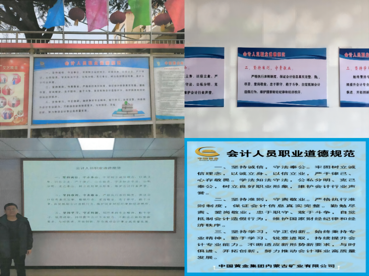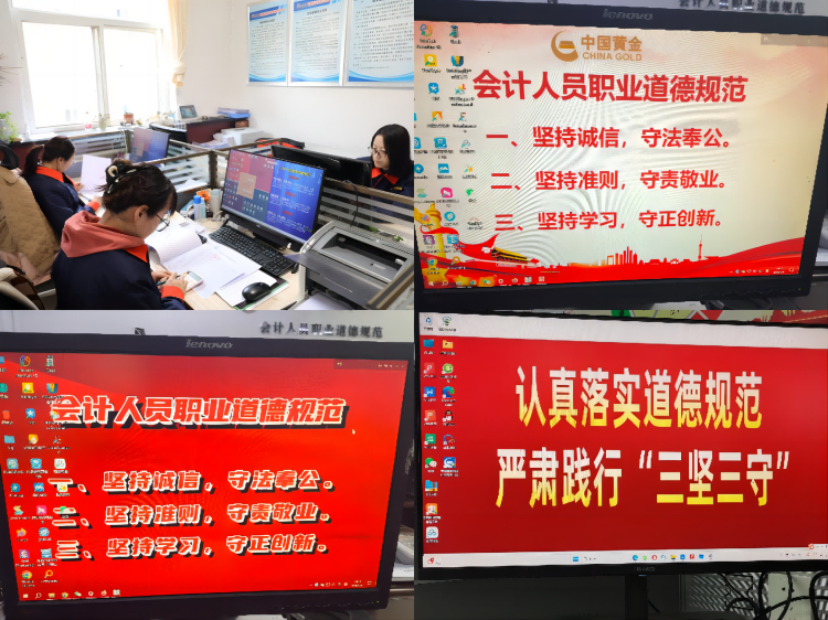 中金黃金權屬及代管企業各資產財務部門認真組織,廣泛開展宣傳活動。充分利用公司OA系統、大屏幕、微信工作群等網絡陣地,大力宣傳《規范》的主要內容和重要意義,包括積極更換財務辦公室墻面宣傳標語;設置宣傳專欄;派發宣傳手冊;建立微信群轉發相關要點;安徽太平公司和甘肅李子公司財務人員創新采用“三堅三守”電腦屏保;湖北雞籠山公司和甘肅西和公司通過動漫小視頻和漫畫方式展現《規范》內容,寓教于樂,融學于趣,使《規范》內容入心入腦,并在實際工作中由資產財務部門負責人檢測每位會計人員對《規范》的遵守情況,努力營造自我約束、模范踐行的良好局面。